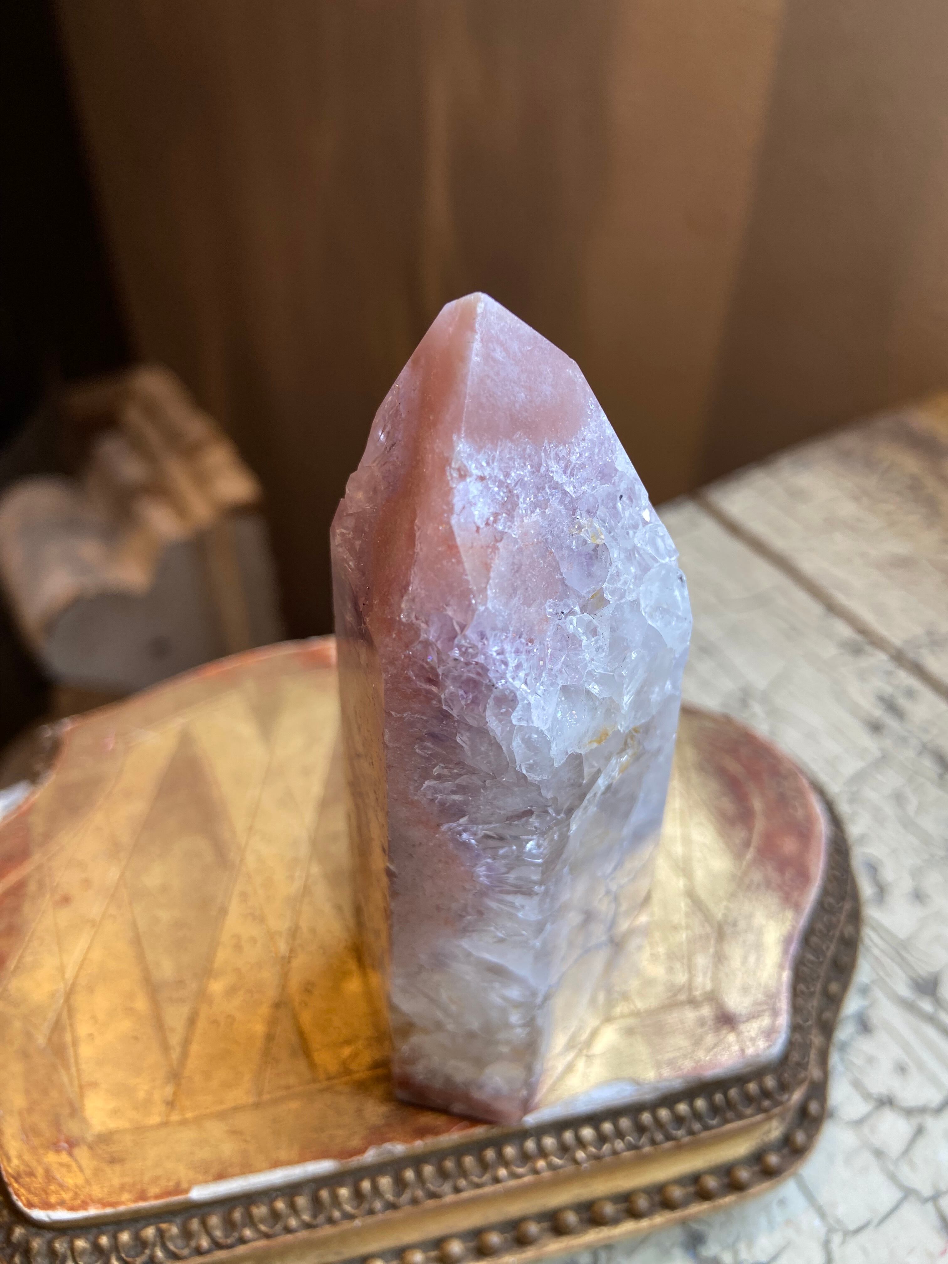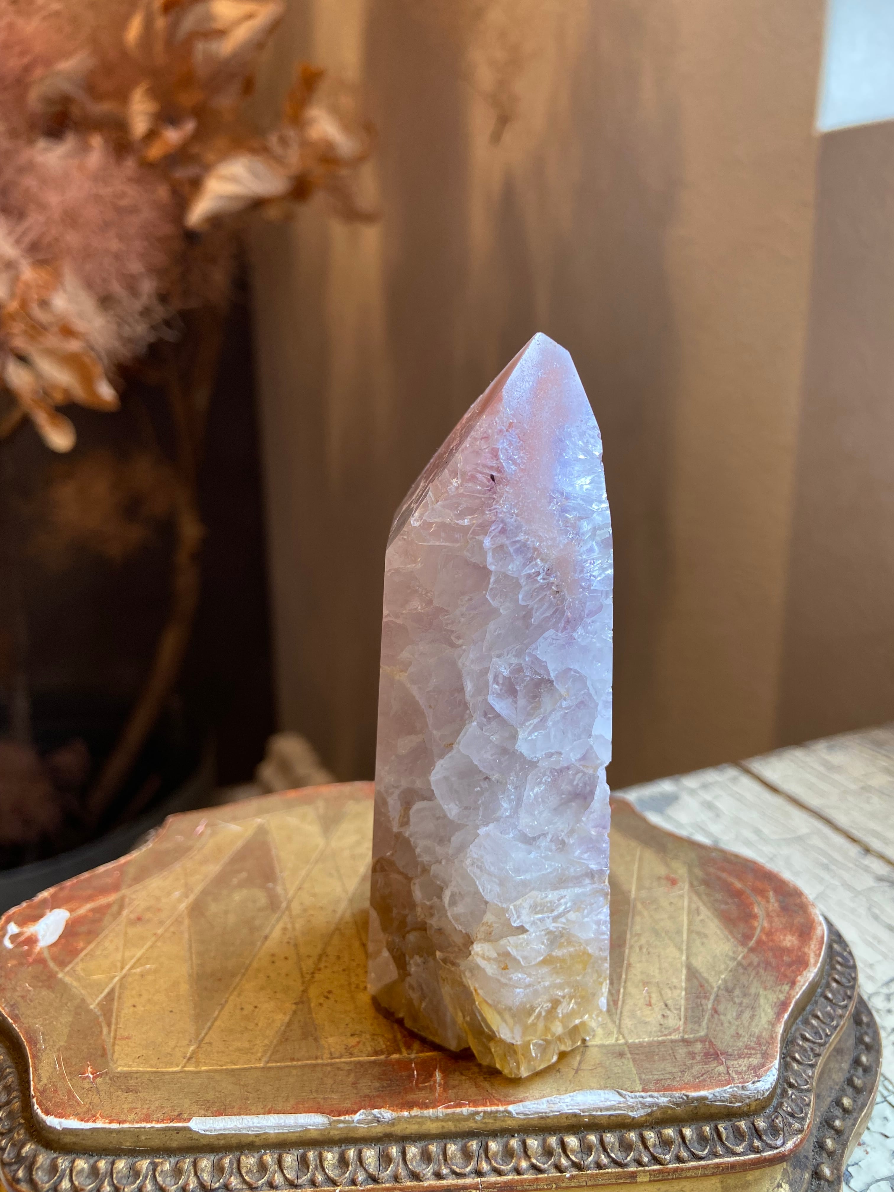 大きめのロックアイスのようなクォーツが重なり、てっぺんにはピンクアメジストがイチゴシロップのようにかかっているかき氷のようなピンクアメジストタワーです。反対側には藤の花のようなパープルクォーツが広ががっており、涼しげで魅力的なクリスタルです。