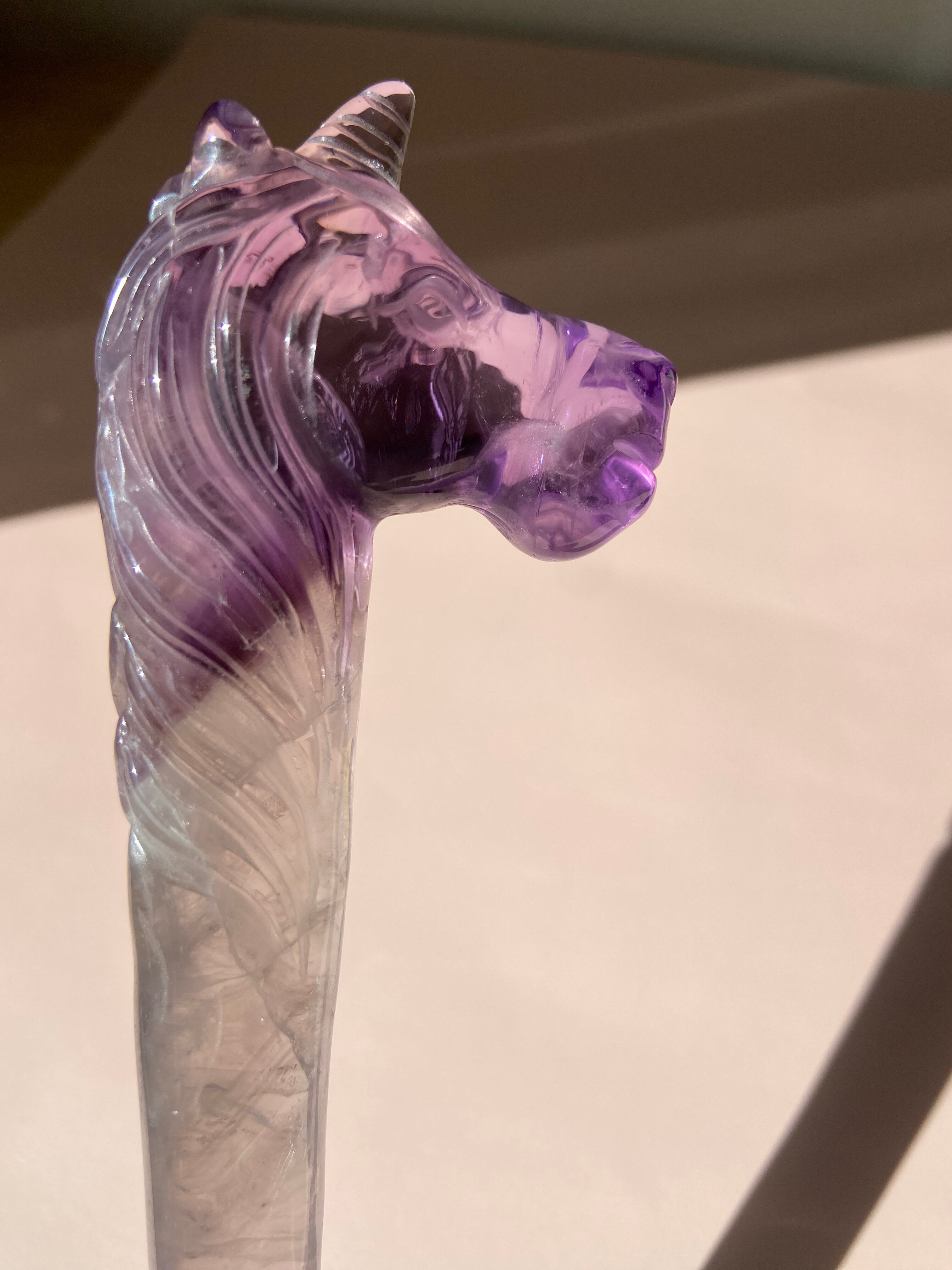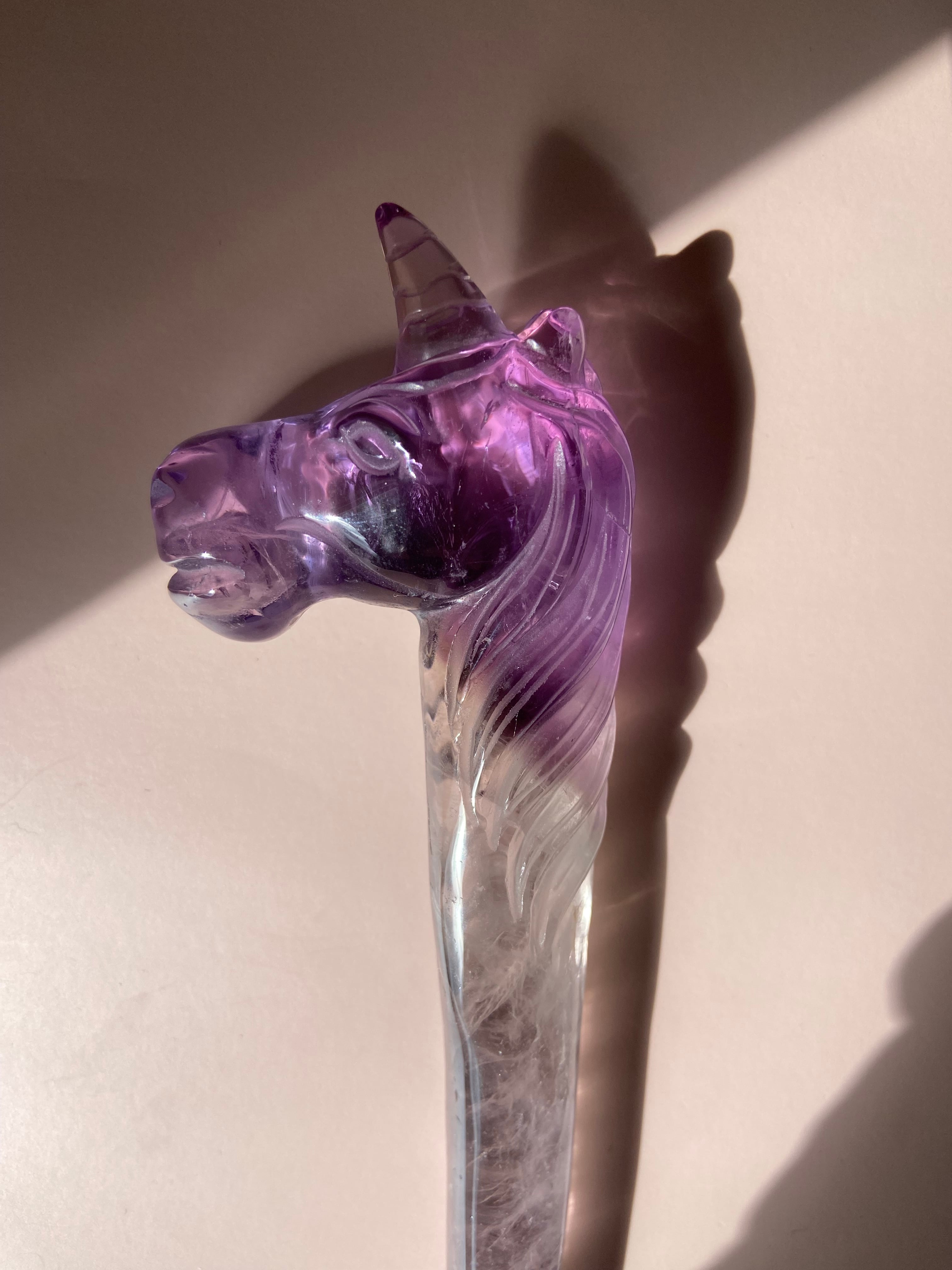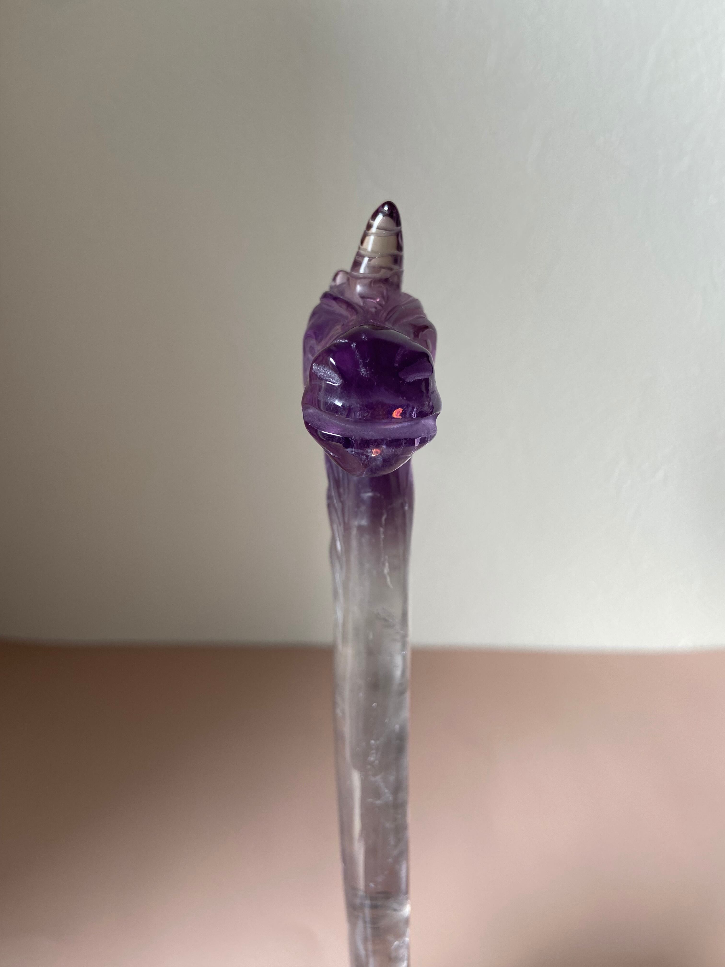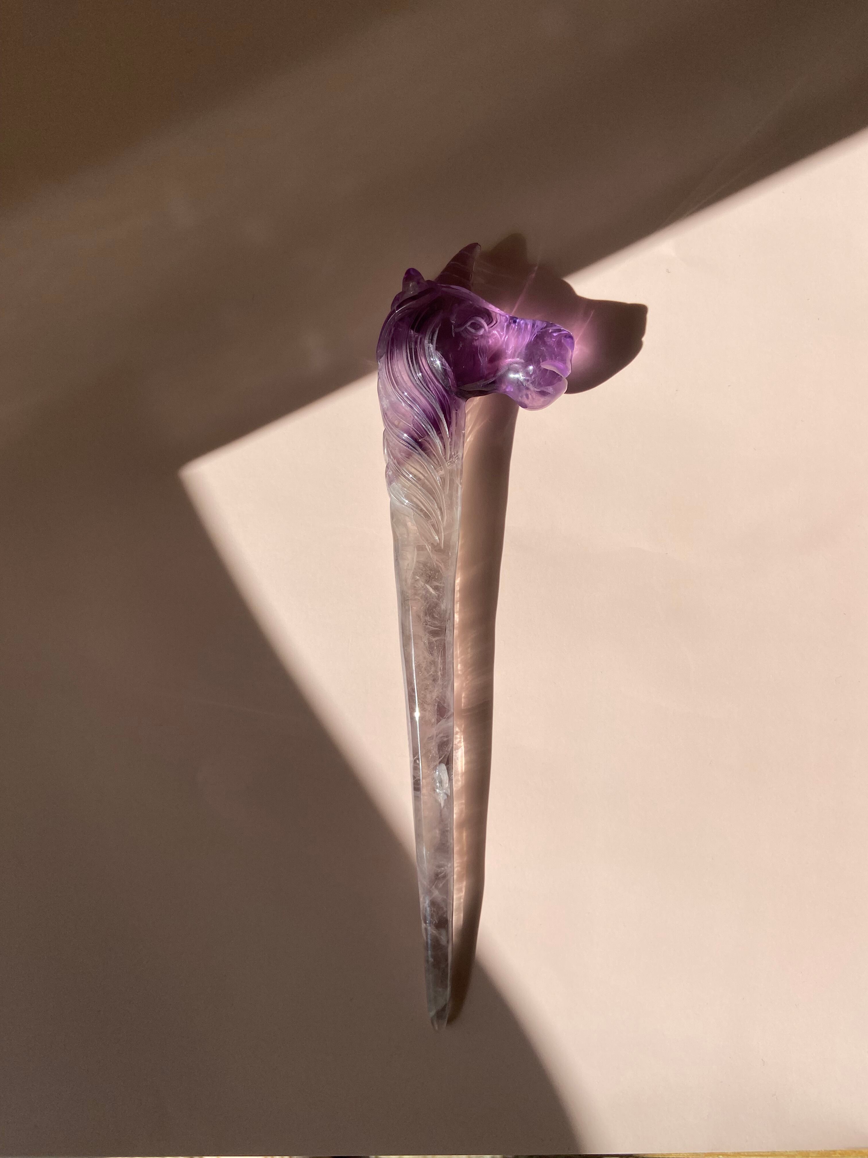 アメジストが煌めくマジカルなユニコーンワンド。まるで魔法の杖のように、夢とファンタジーの世界へ誘ってくれそうです。アメジストは古代からの神聖なパワーストーンとして知られ、心の安定や直感力の向上に効果があるとされています。