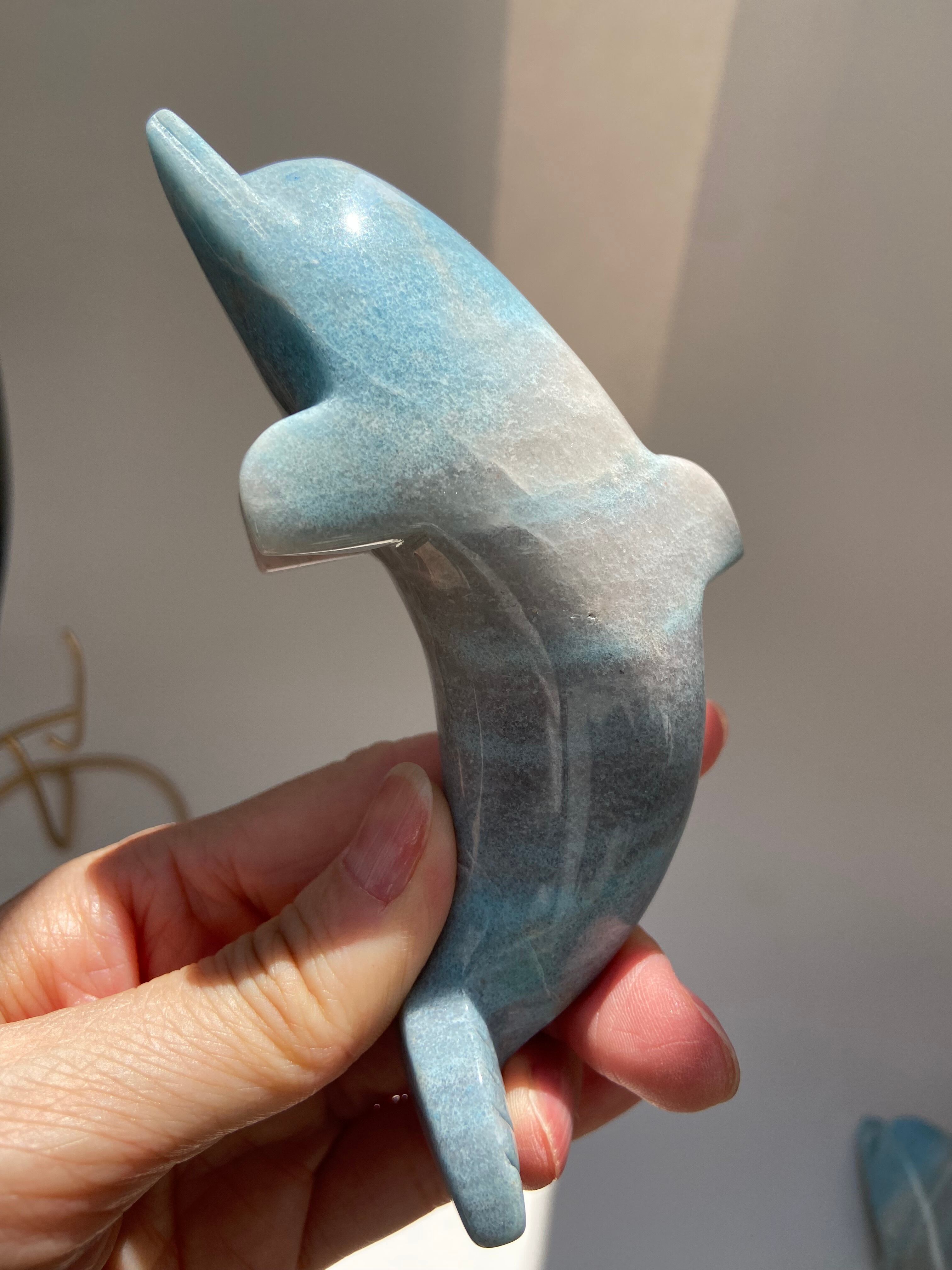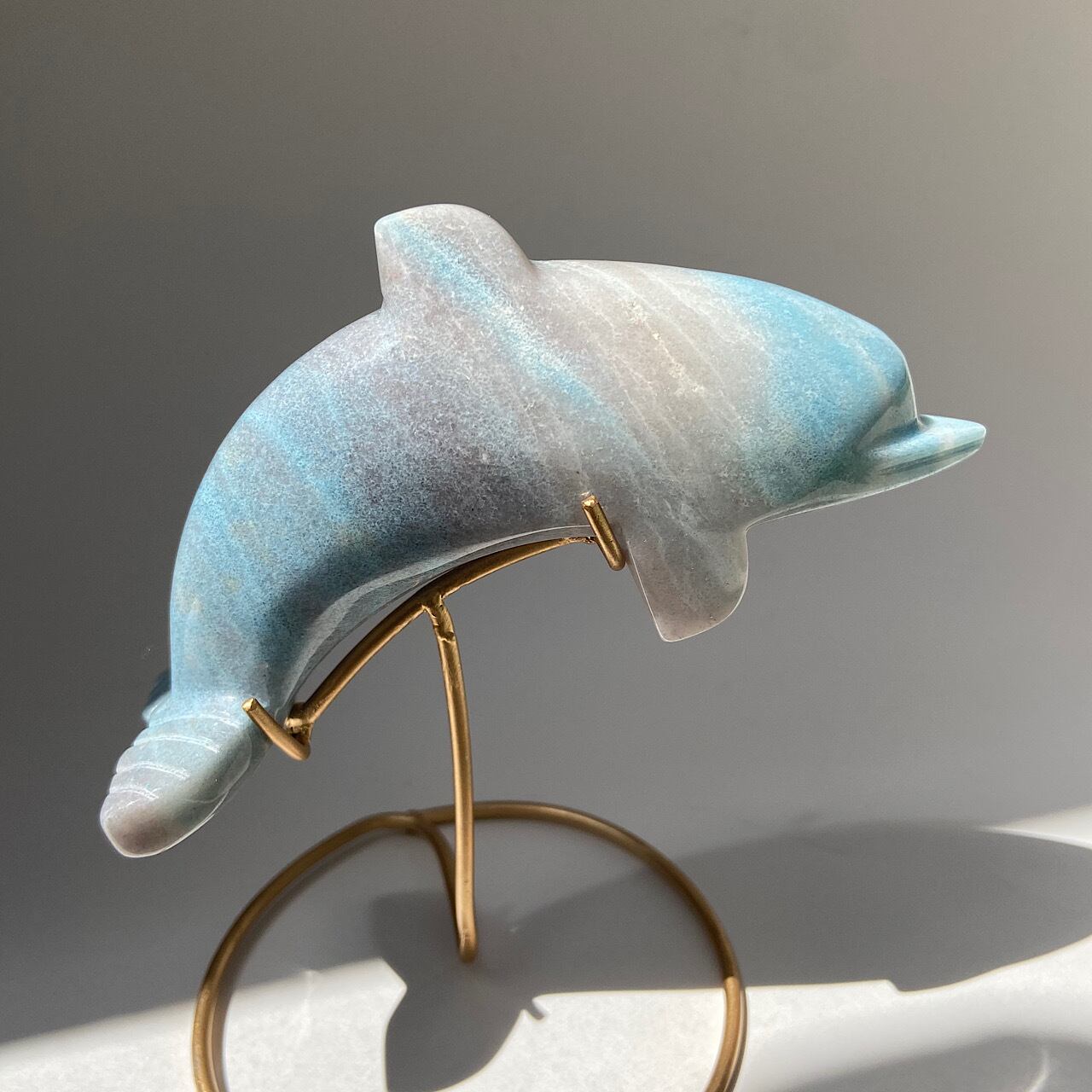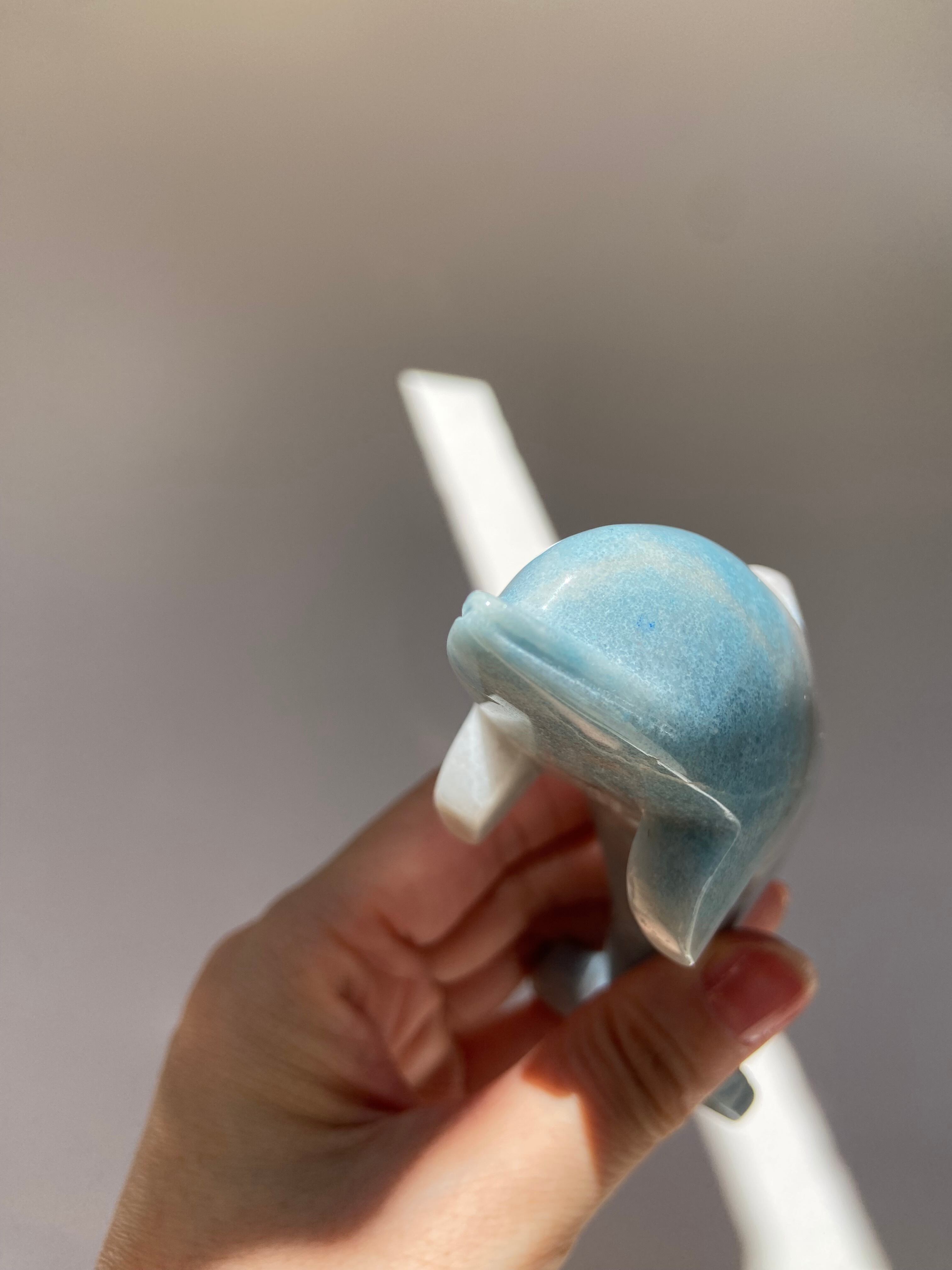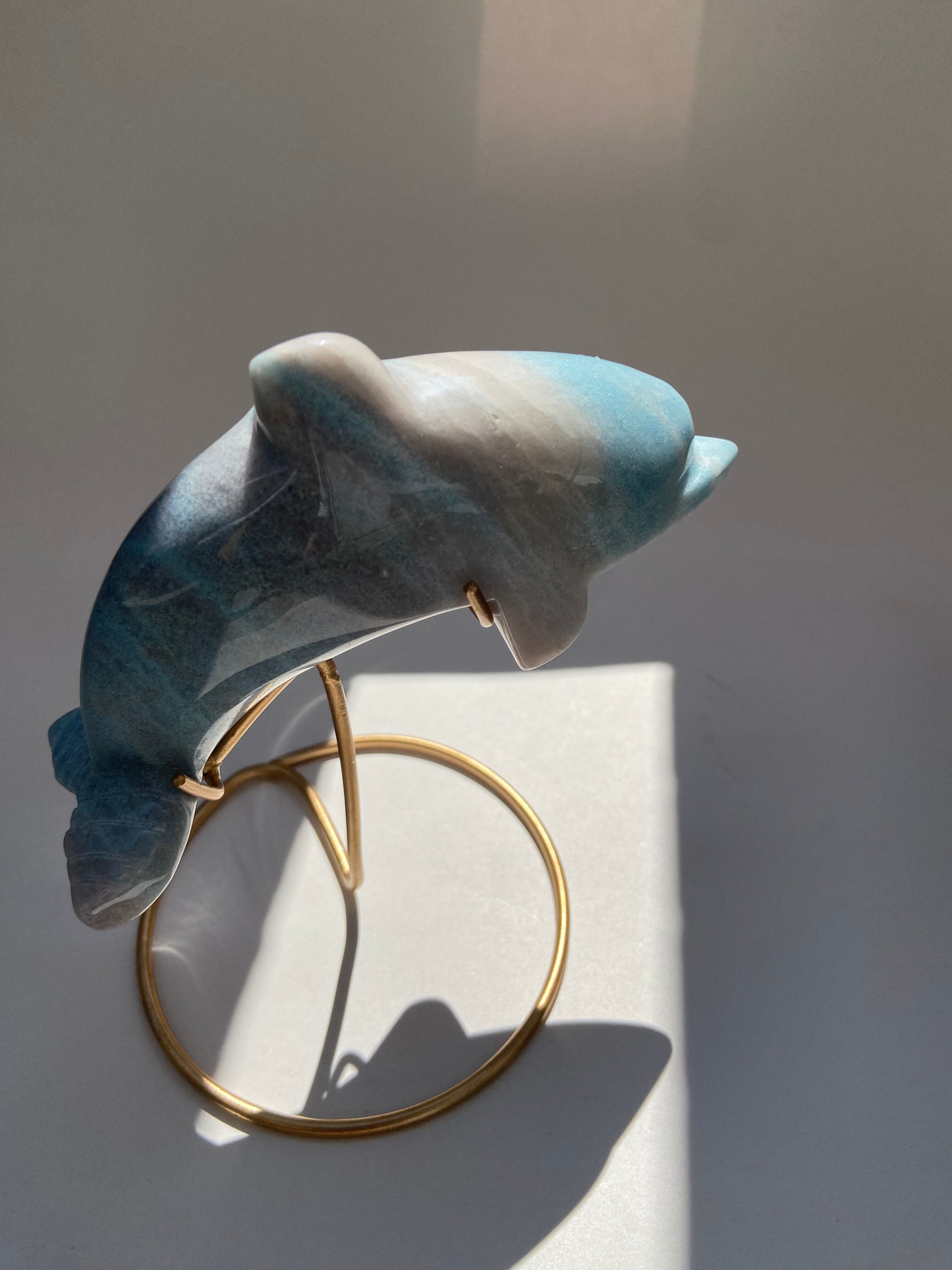 ブラジル産トロレアイトのイルカです。鮮やかな水色、軽いグレーとホワイトが特徴のトロレアイトと海を泳ぐ神秘的な生きもの、イルカのイメージがとても合います。妖精を意味するトロールが語源となりトロール石とも呼ばれます。実物はもっと光に包まれたような優しい色合いです。アフリカ、オーストラリアなど世界各地にはイルカは別の星からやってきたという伝承があります。星のクリスタルと飾っても素敵ですね。スタンドが付きます。
