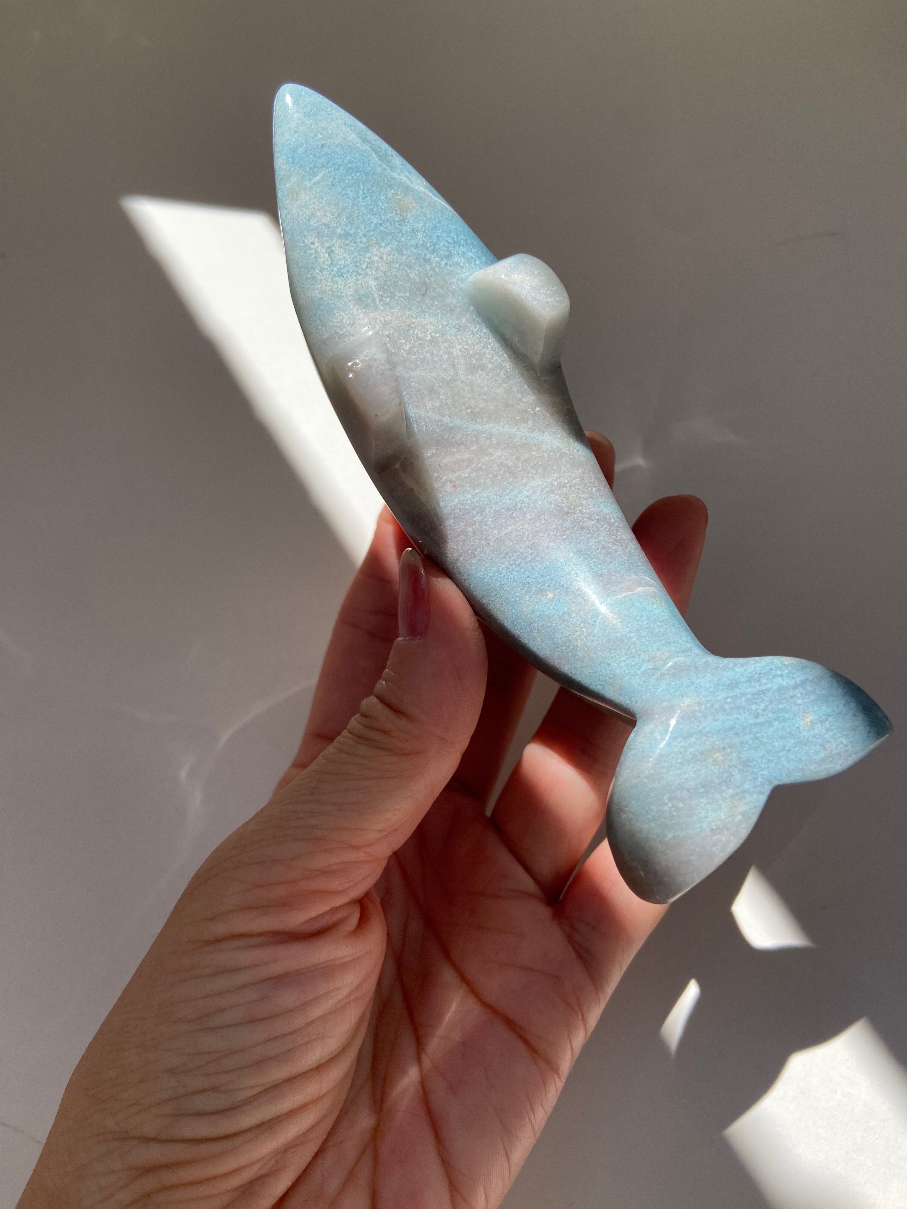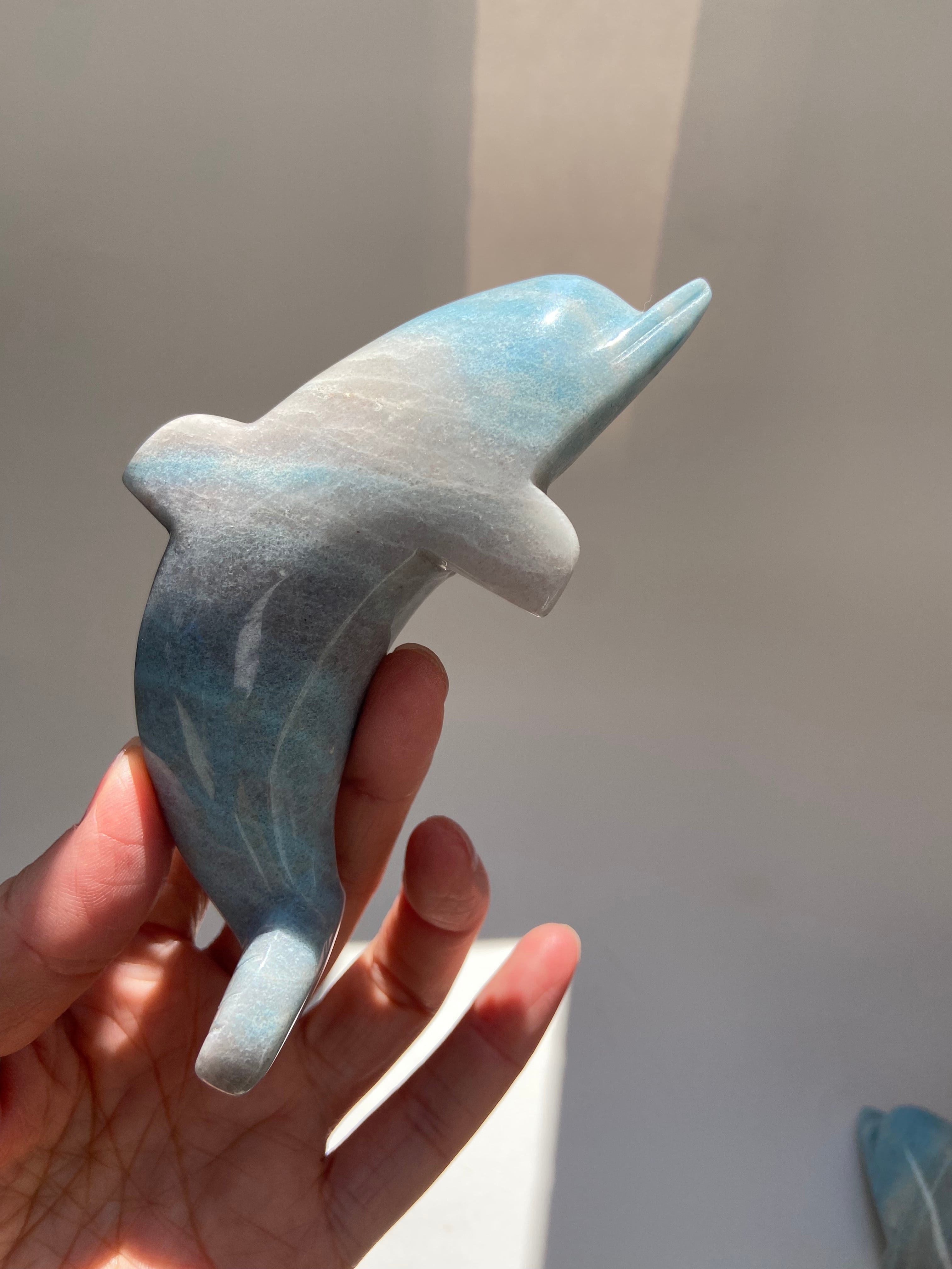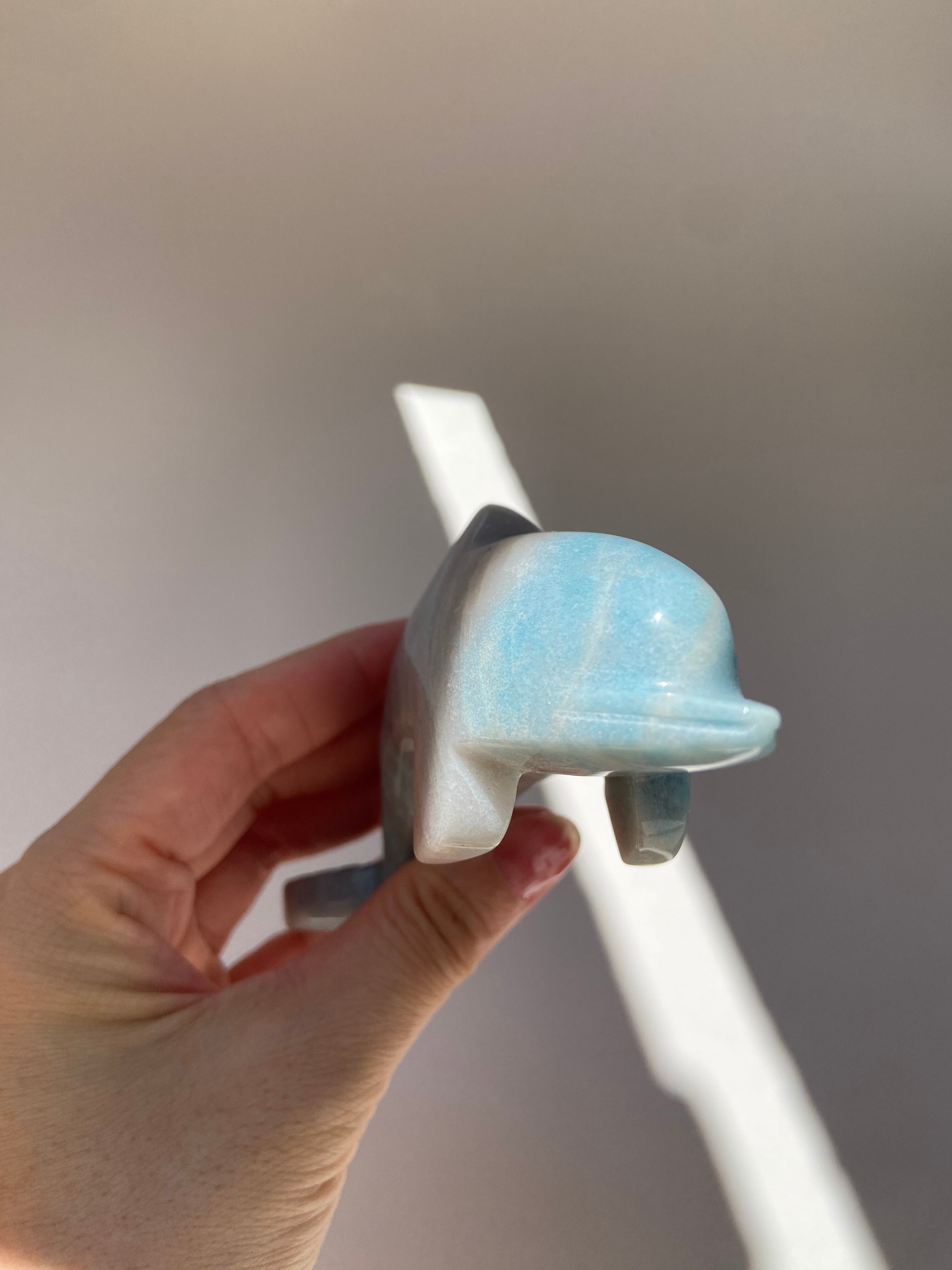 ブラジル産トロレアイトのイルカです。鮮やかな水色、軽いグレーとホワイトが特徴のトロレアイトと海を泳ぐ神秘的な生きもの、イルカのイメージがとても合います。妖精を意味するトロールが語源となりトロール石とも呼ばれます。実物はもっと光に包まれたような優しい色合いです。アフリカ、オーストラリアなど世界各地にはイルカは別の星からやってきたという伝承があります。星のクリスタルと飾っても素敵ですね。スタンドが付きます。