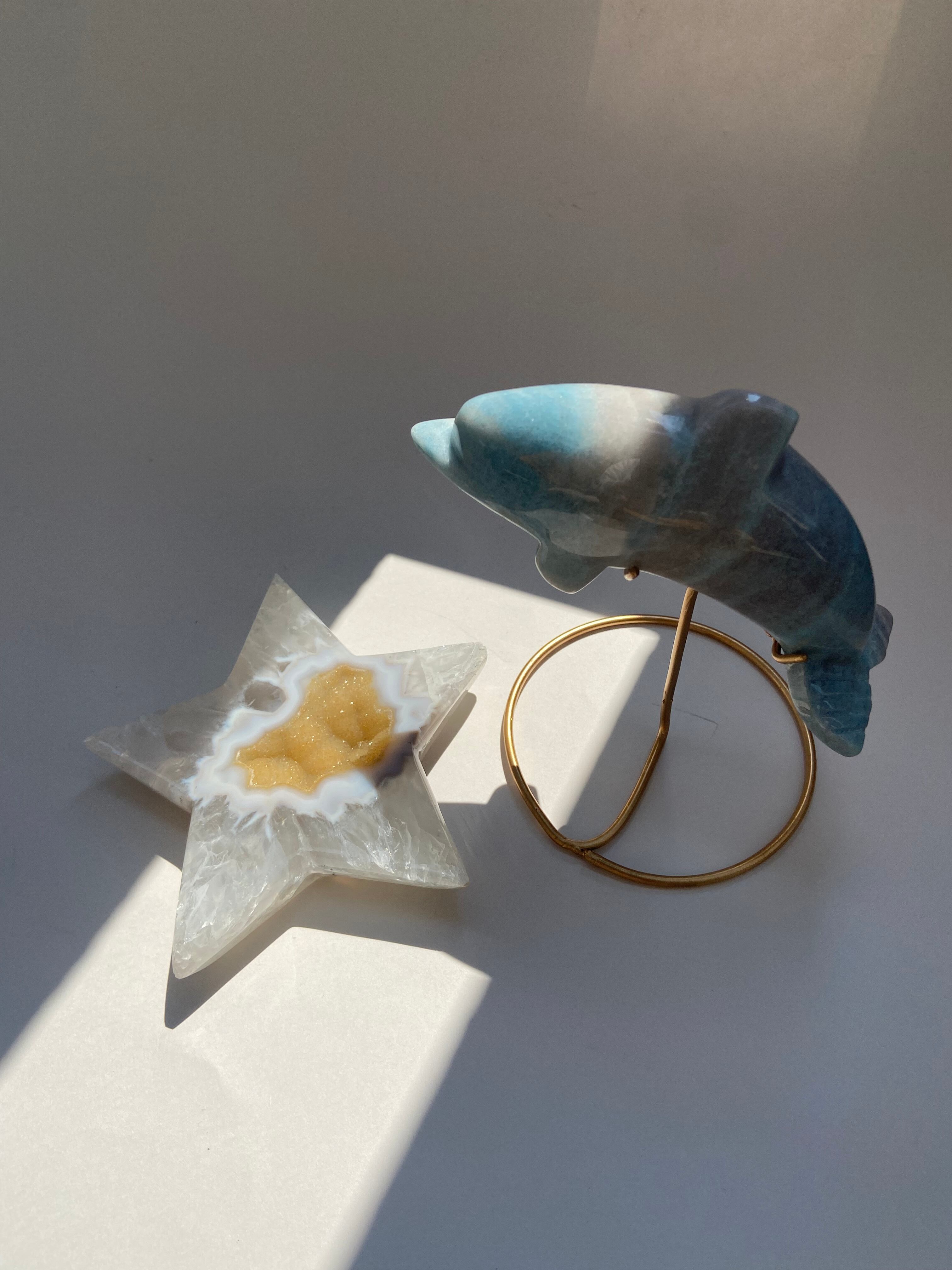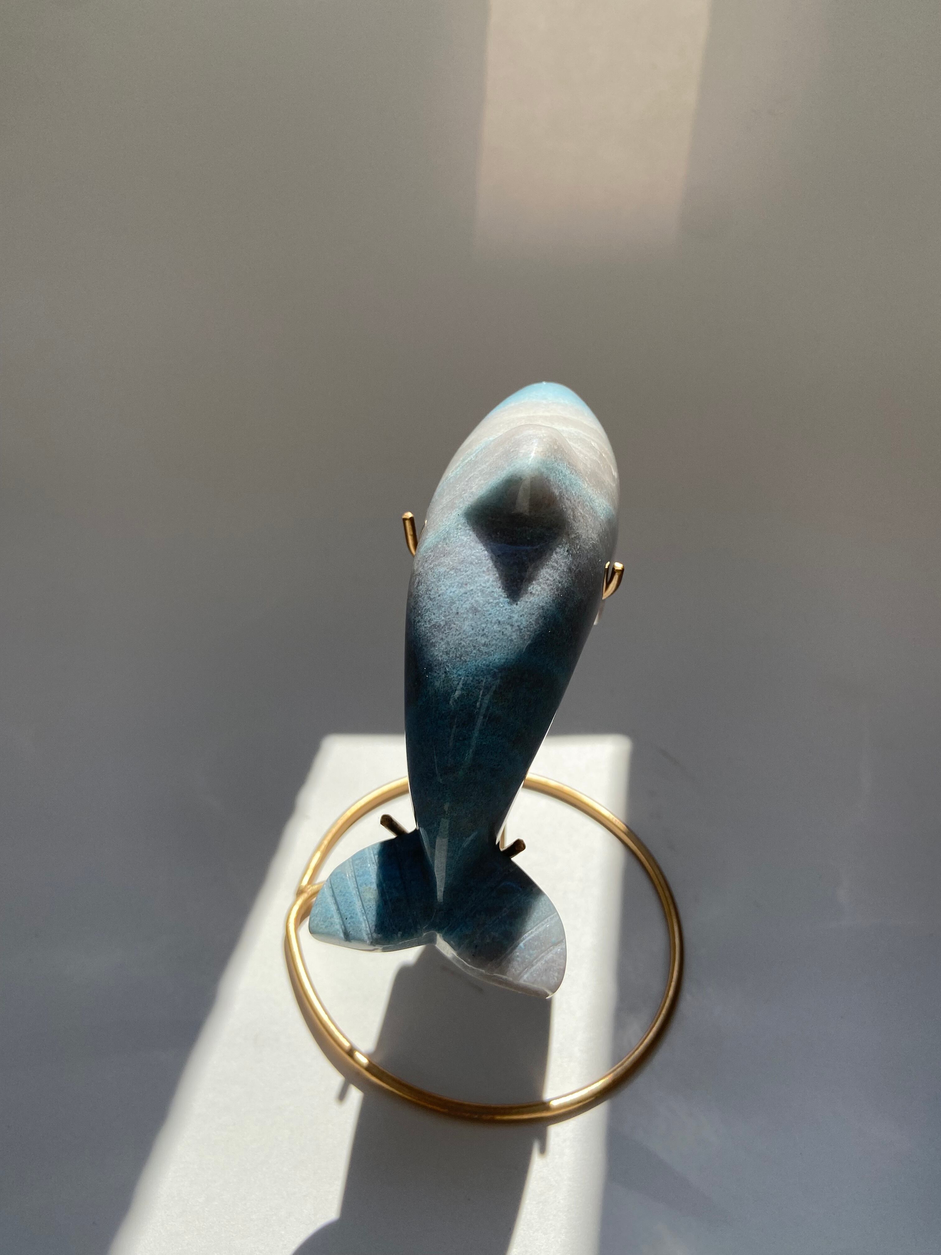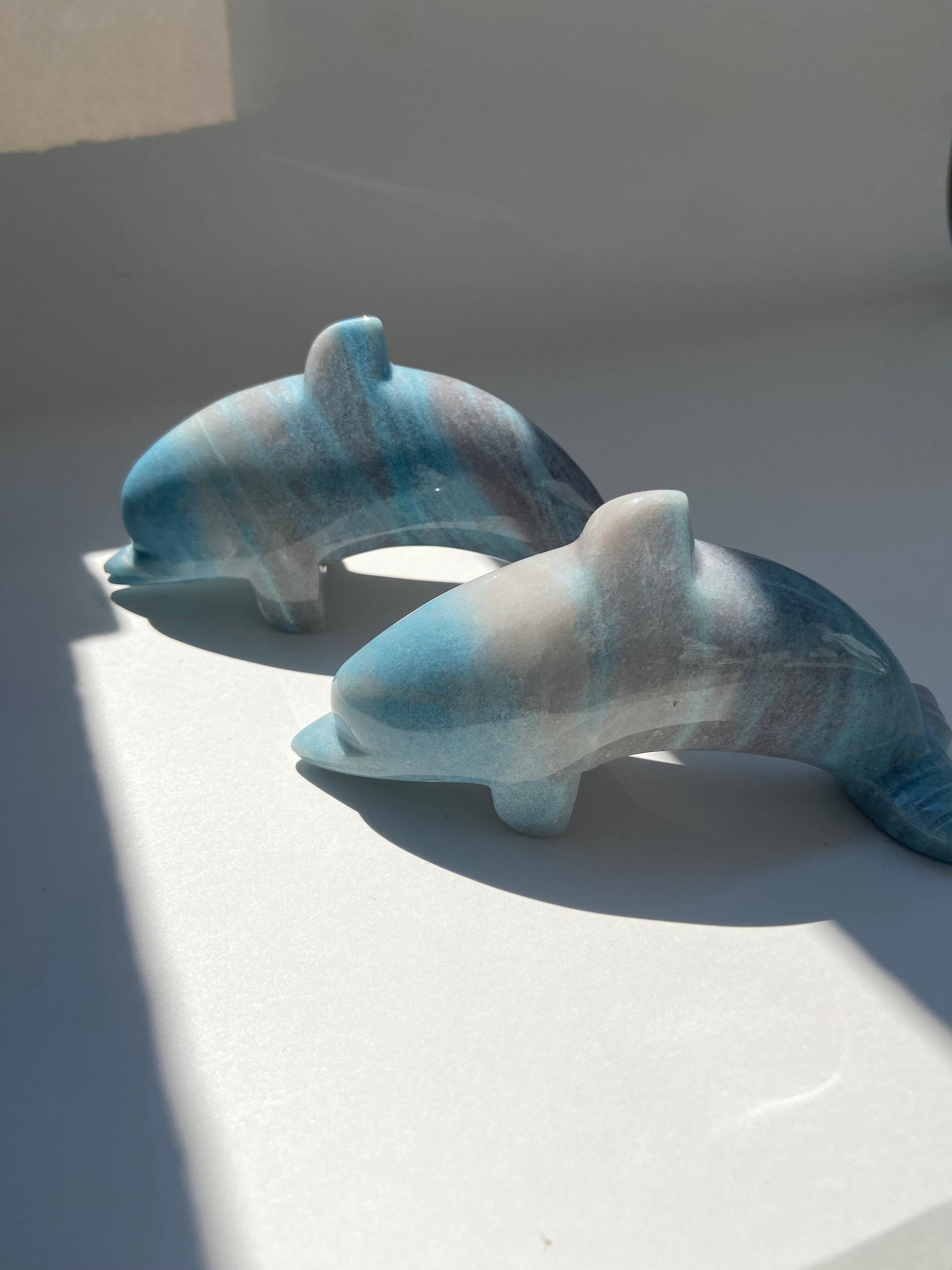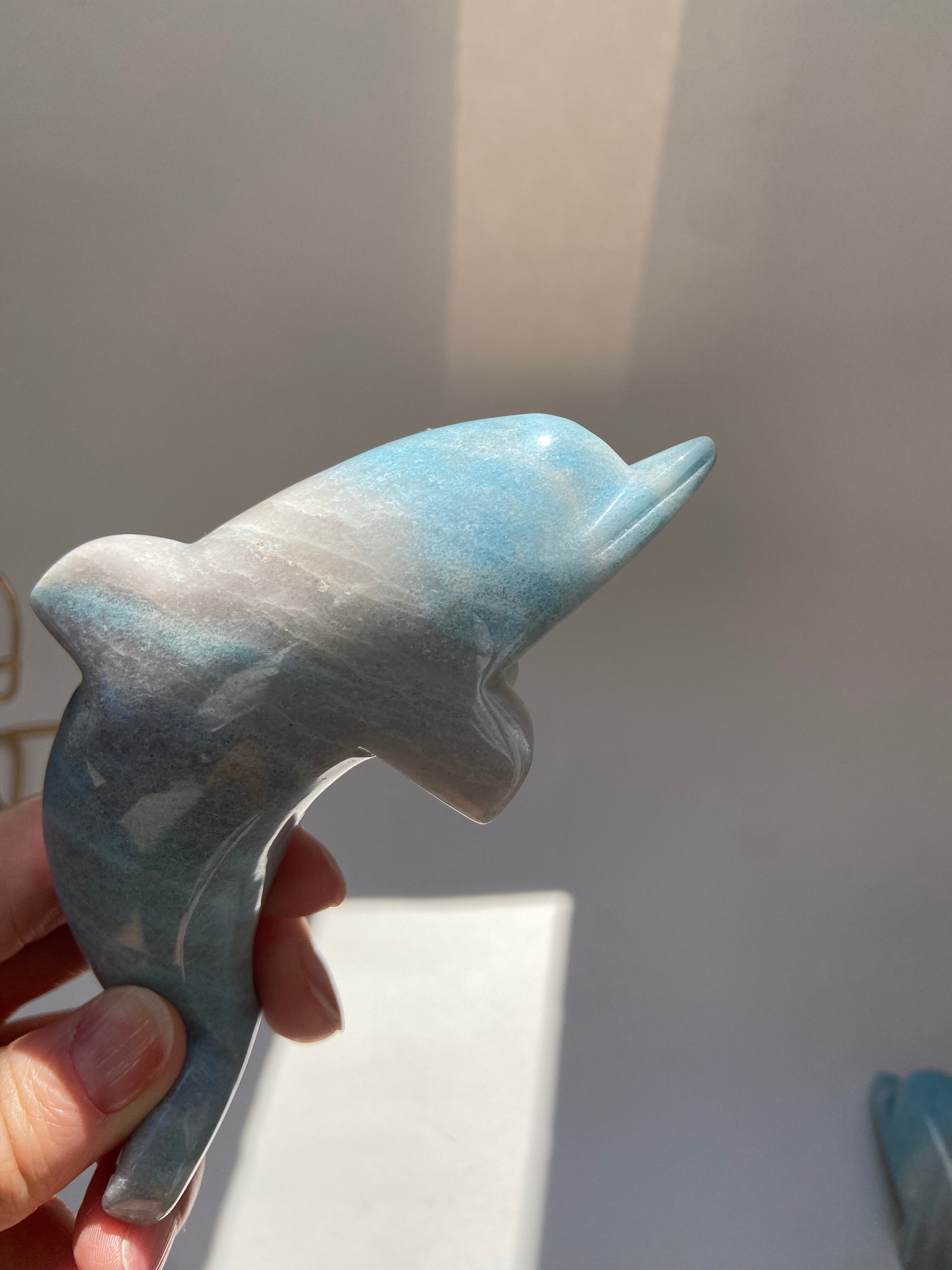 ブラジル産トロレアイトのイルカです。鮮やかな水色、軽いグレーとホワイトが特徴のトロレアイトと海を泳ぐ神秘的な生きもの、イルカのイメージがとても合います。妖精を意味するトロールが語源となりトロール石とも呼ばれます。実物はもっと光に包まれたような優しい色合いです。アフリカ、オーストラリアなど世界各地にはイルカは別の星からやってきたという伝承があります。星のクリスタルと飾っても素敵ですね。スタンドが付きます。