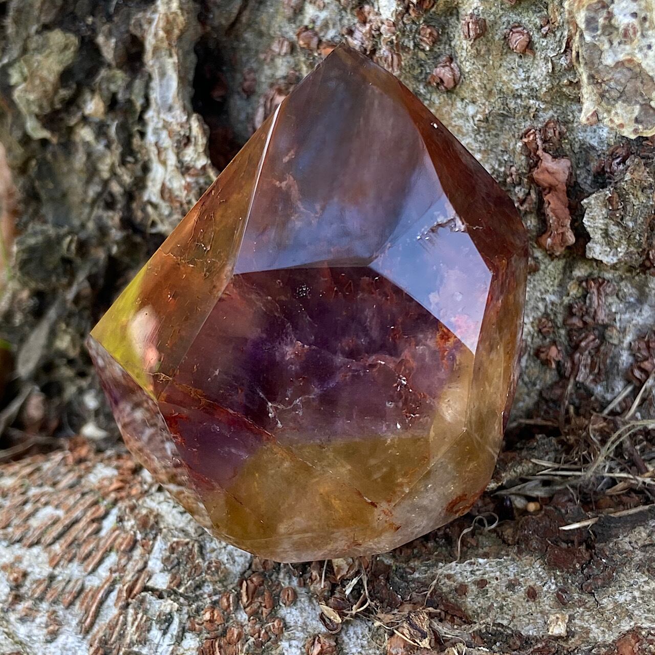 ブラジル産(ゴイアス州クリスタリナ)レムリアンクォーツの上にアメジスト、スモーキークォーツ、カコクセナイト、ゲーサイト、タンジェリン、レピドクロサイト等の結晶がコートを纏うようにコーティングされたドリーミーなポリッシュポイントです。底から覗くと虹を携えたレムリアンクォーツがキラキラと輝き、またその成長過程も見えます。ドリームコートが発見されたポケット(晶洞)を掘り進めて行くと最終的には深紅のものが採掘されました。オレンジ〜赤褐色の層を持つものがレッド•ドリームコートと呼ばれます。
