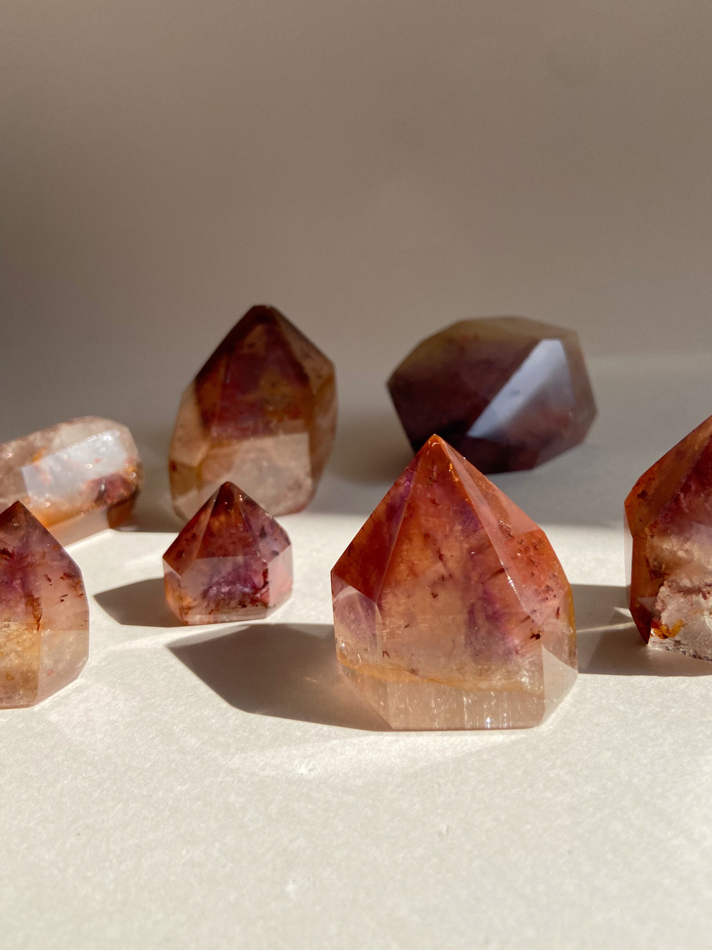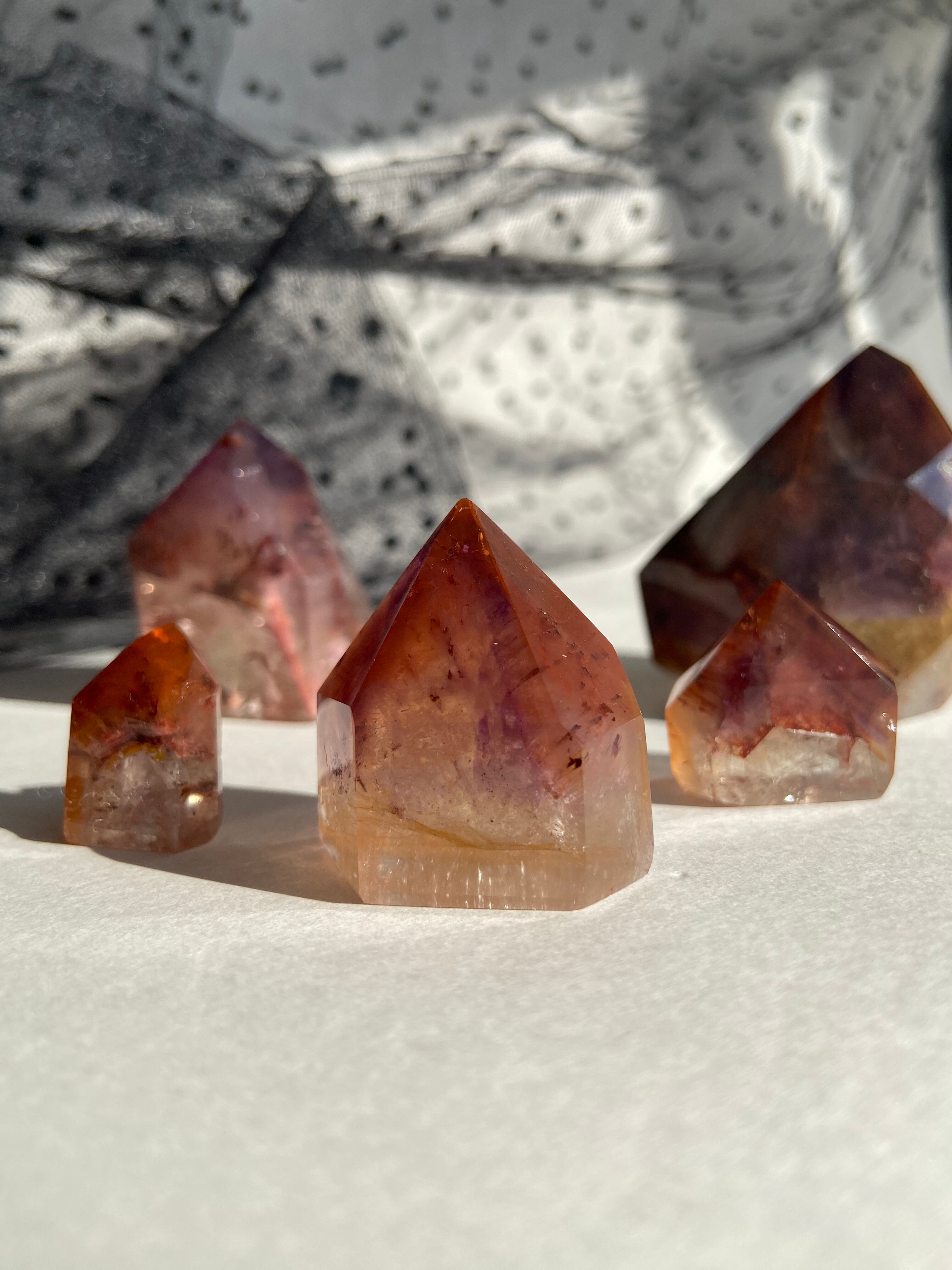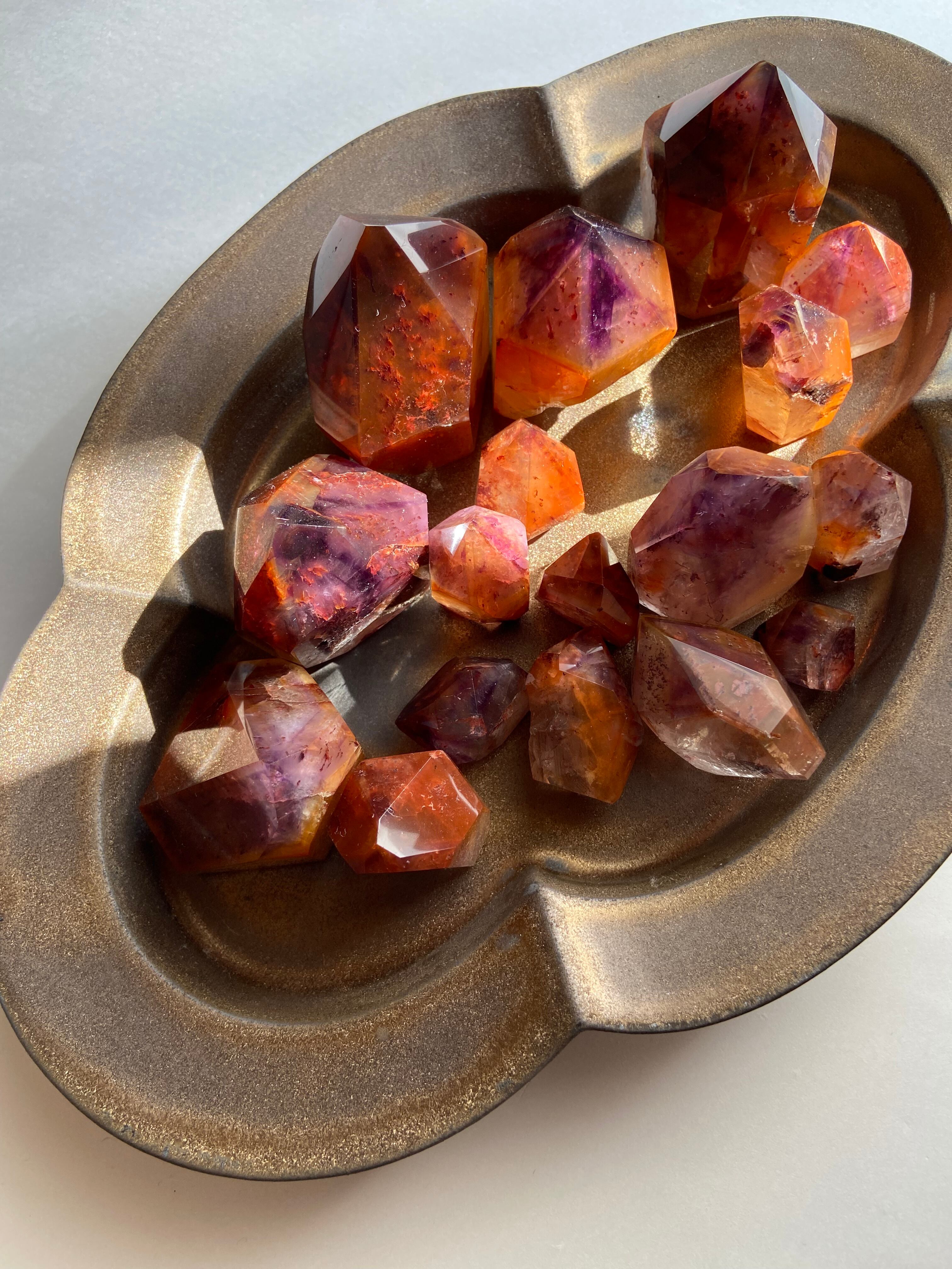 鉄分によって赤く色づいた下にアメジストのパープルのファントムが見られるもの、クラックから虹をたくさん輝き放ちキュートなオレンジで可愛らしいもの、落ち着いた不動な雰囲気を持つもの、と個性豊かですので是非動画を参考にご覧ください。