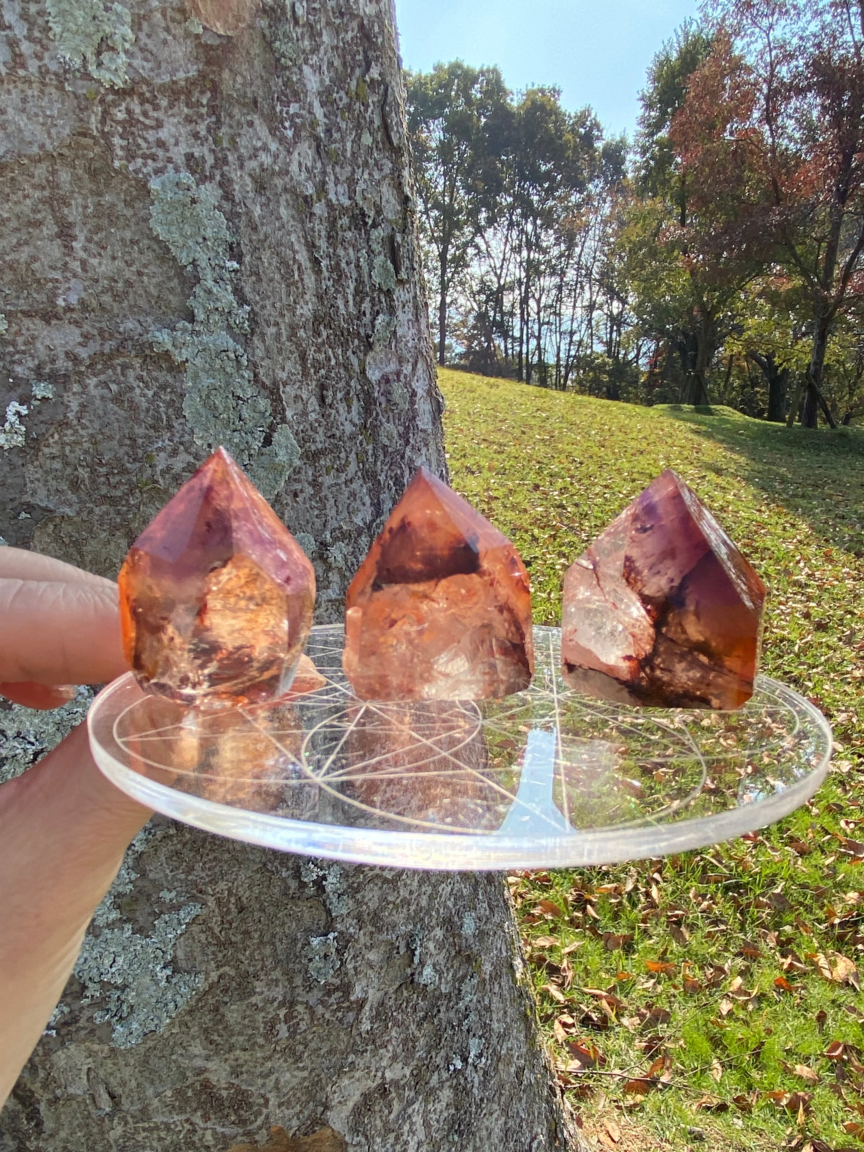 鉄分によって赤く色づいた下にアメジストのパープルのファントムが見られるもの、クラックから虹をたくさん輝き放ちキュートなオレンジで可愛らしいもの、落ち着いた不動な雰囲気を持つもの、と個性豊かですので是非動画を参考にご覧ください。