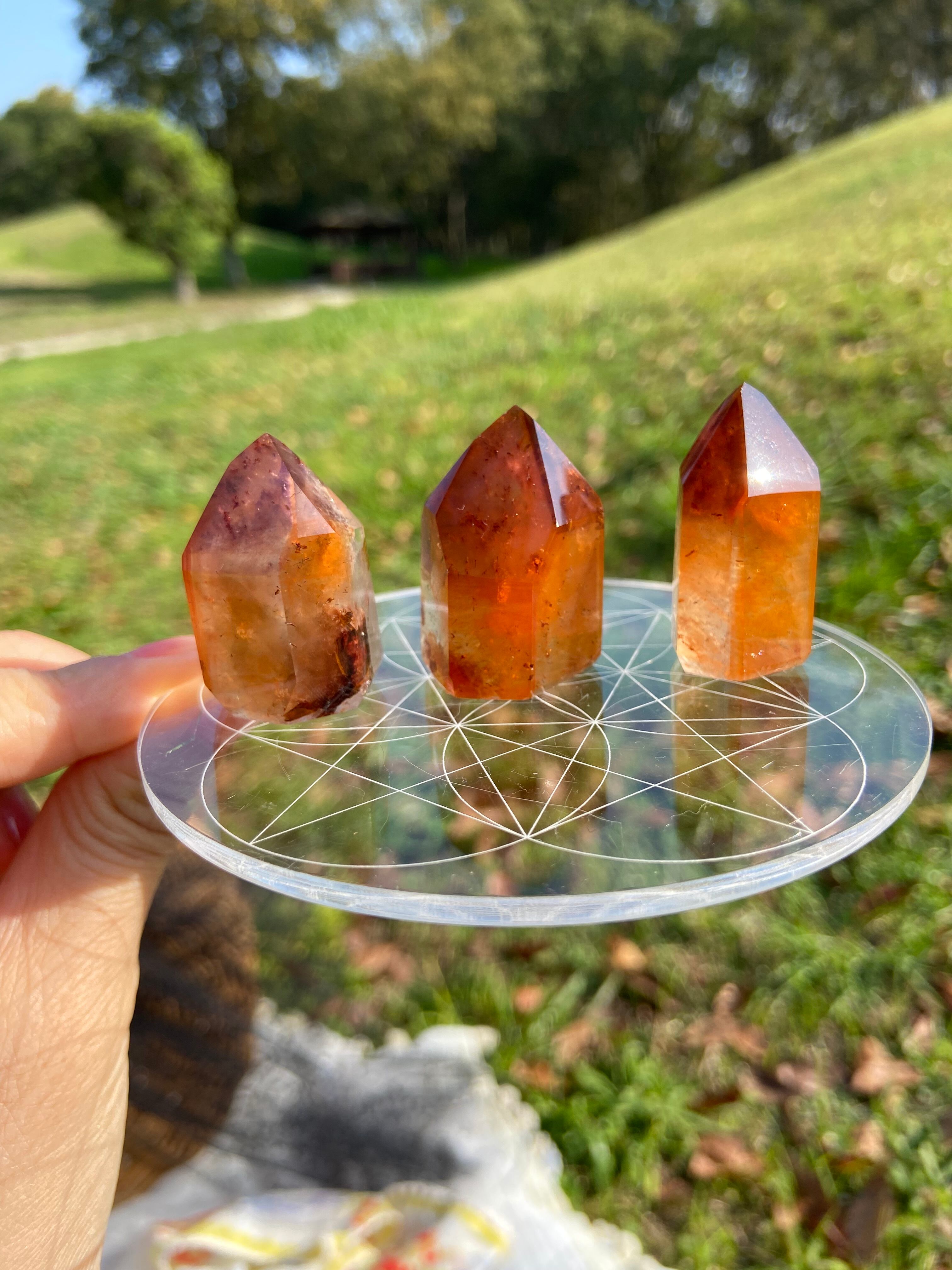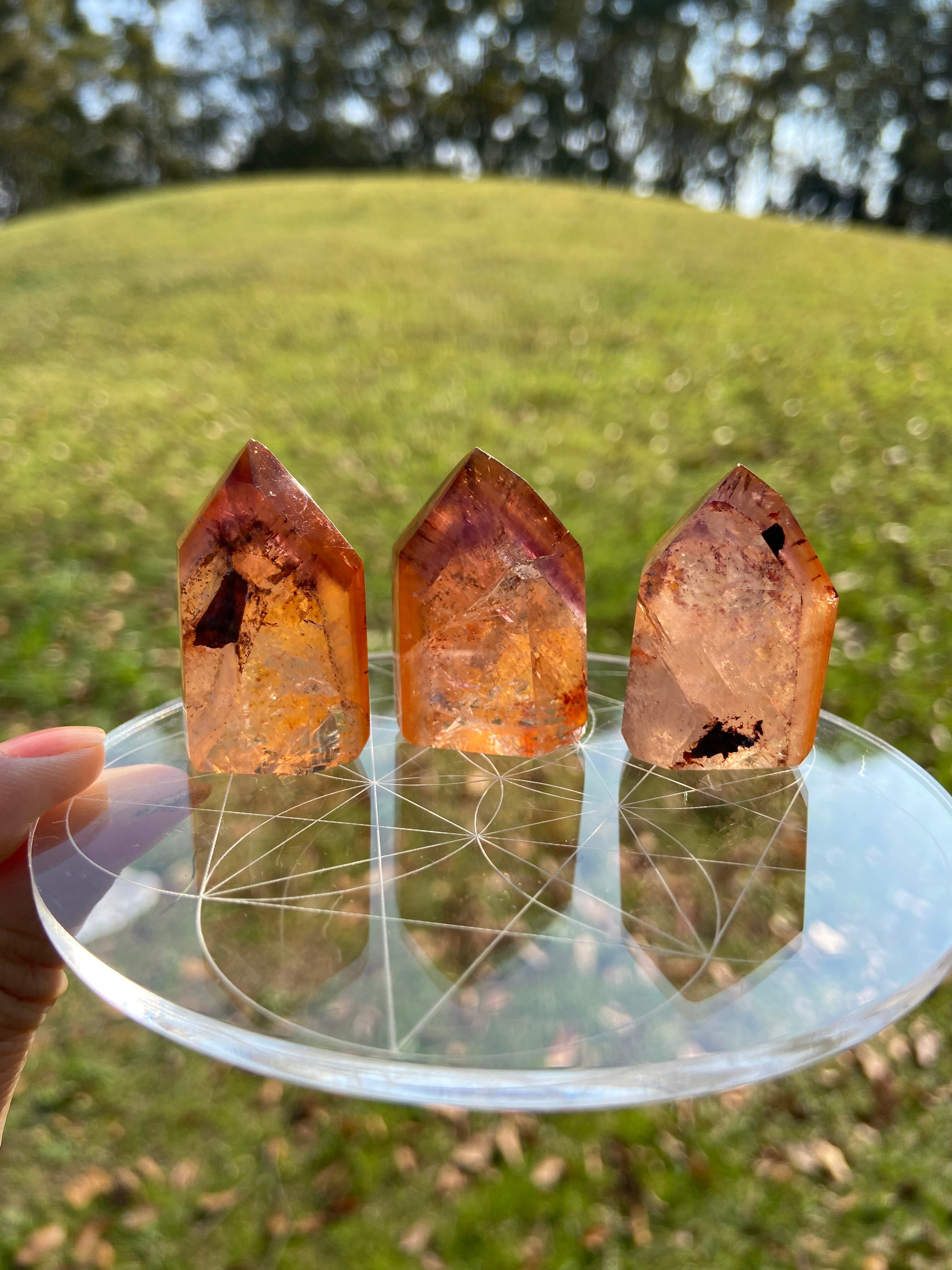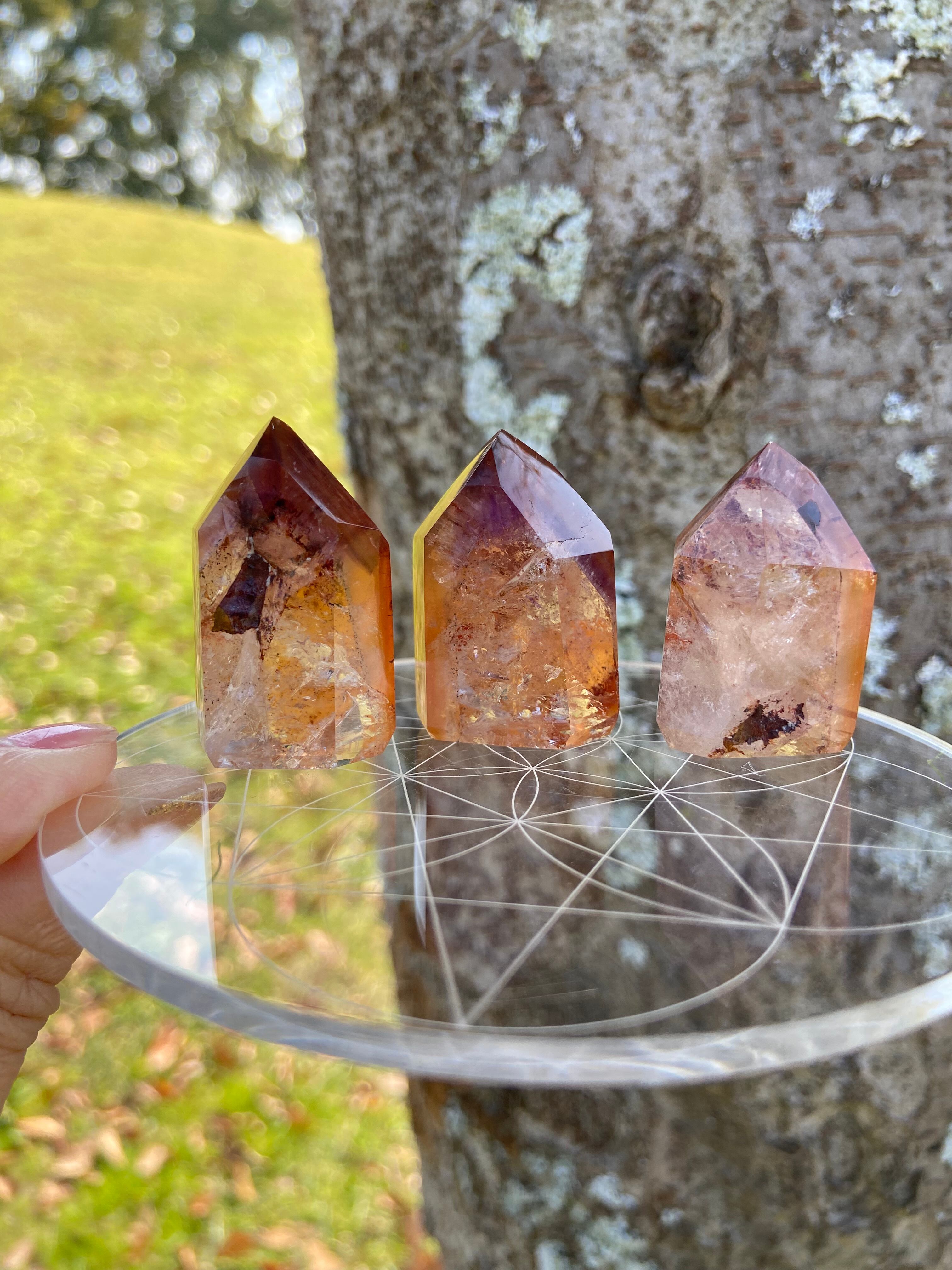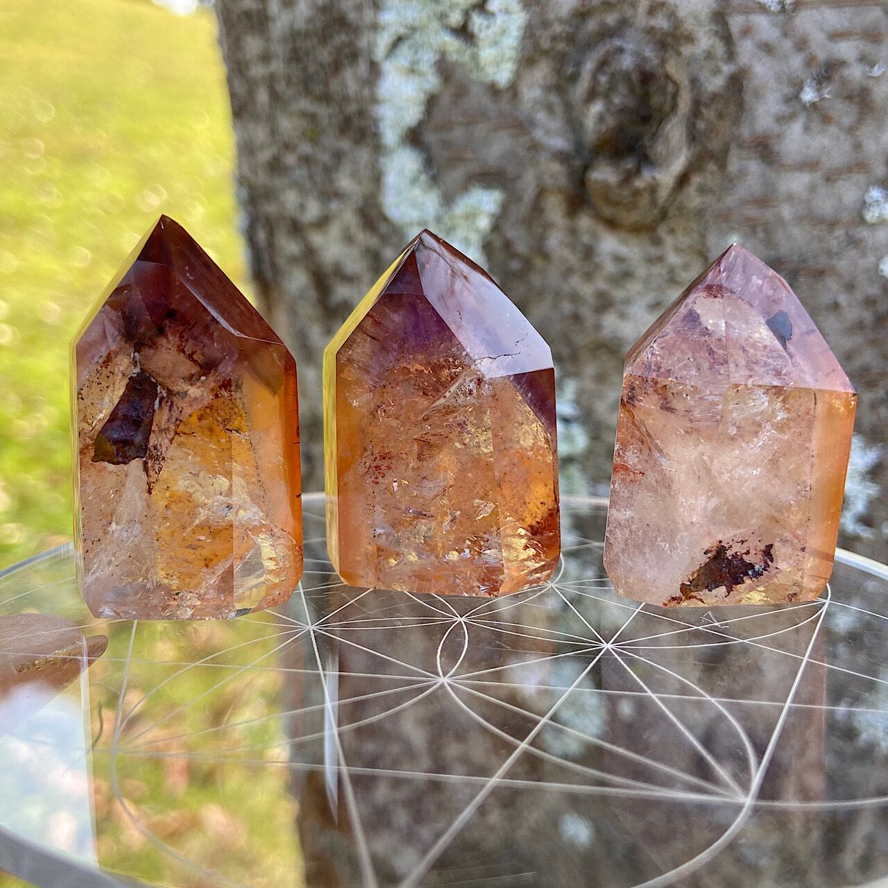 ミニポイントセット。小さくもレムリアンクォーツの虹と透明度が素晴らしく、アメジストのパープルとオレンジのコーティングがとても綺麗なものです。クリスタルグリッドにもお勧めの3個です。
